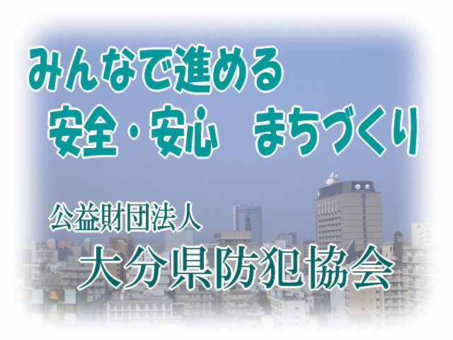 (公財)大分県防犯協会 … こちらは公益財団法人 大分県防犯協会のホームページ(TOPページ)です。 (公財)大分県防犯協会は、犯罪の防止又は青少年の健全な育成・並びに地域社会の健全な発展のための事業を行い、 県民を犯罪から守って、明るく安全で安心して暮らせる大分県の実現に寄与することを目的とした公益団体です。 【防犯 協会 防犯活動 犯罪の予防 防犯対策 自転車防犯登録 環境浄化 風俗環境 古物商 AM ポスター 標語 広報誌 大分の防犯 賛助会員 ダメぜったい 県民大会】